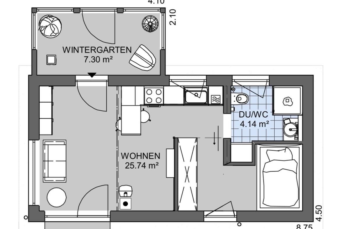 einer einzigen Ebene von nur ca. 30m² zzgl. eines ca. 7m²-Wintergartens wurde intelligent